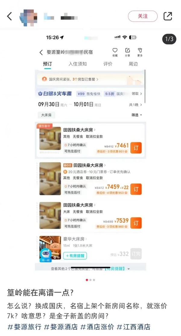 而此事件并不是孤例。同一天,有记者在某社交平台发现,不少网友吐槽江西婺源景区多家民宿价格暴涨,原本200多元一晚的酒店在某平台挂出每天4000多元甚至7000多元的高价。