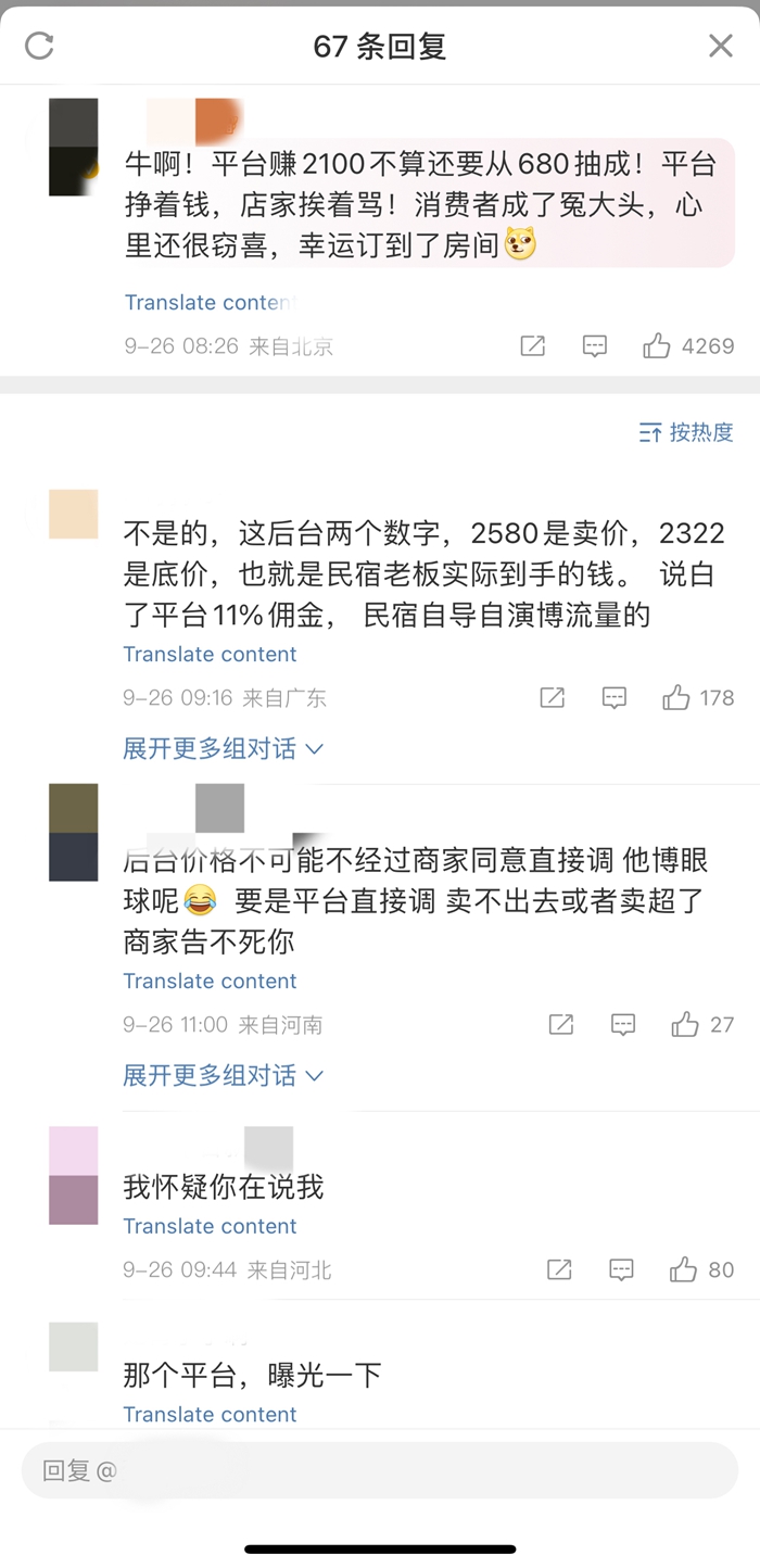 还有旅游企业相关负责人称,平台会根据接入商家的订单营业额收取一定比例的服务费,“先不说平台没有定价权,即使平台自己去调整一个很高的价格,没人住的话平台一样拿不到服务费。”