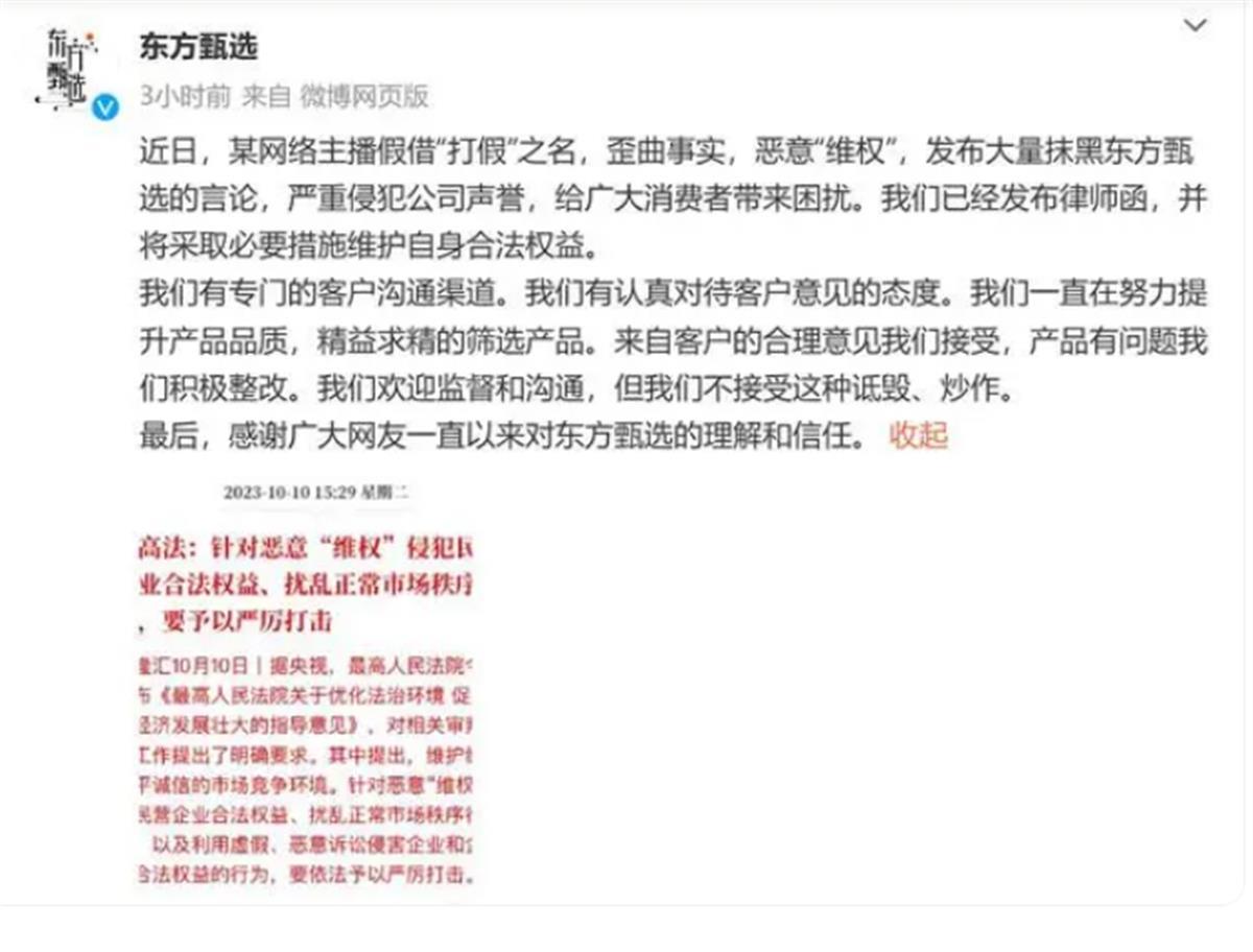 10月13日,东方甄选发布声明:近日,某网络主播假借“打假”之名,歪曲事实,恶意“维权”,发布大量抹黑东方甄选的言论,严重侵犯公司声誉,给广大消费者带来困扰。我们已经发布律师函,并将采取必要措施维护自身合法权益。《每日经济新闻》报道,记者今日从东方甄选方面了解到,东方甄选已就百万粉丝打假博主“铁头惩恶扬善”(下文称“铁头”)将对东方甄选产品打假一事发布了律师函。(据10月13日每日经济新闻)