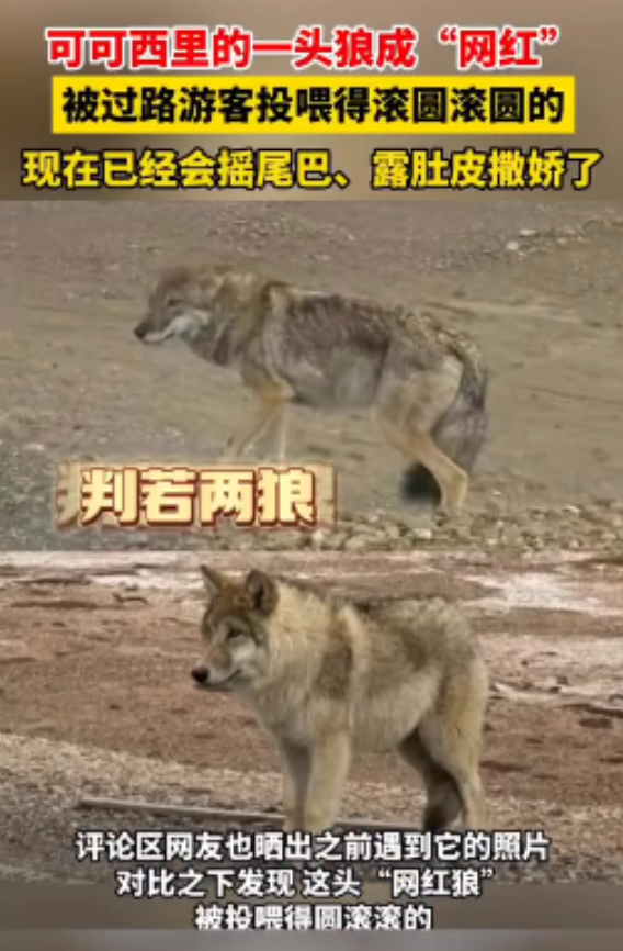 近日,有网友发布视频称,青海可可西里的一头野狼因经常被过往游客和司机投喂,已经“判若两狼”,不但体型变得滚圆,还会向过往车辆摇尾巴、露肚皮撒娇讨食。随后,这头“被投喂成网红”的野狼迅速走红,引发网友广泛关注和讨论。(据10月23日红星新闻)