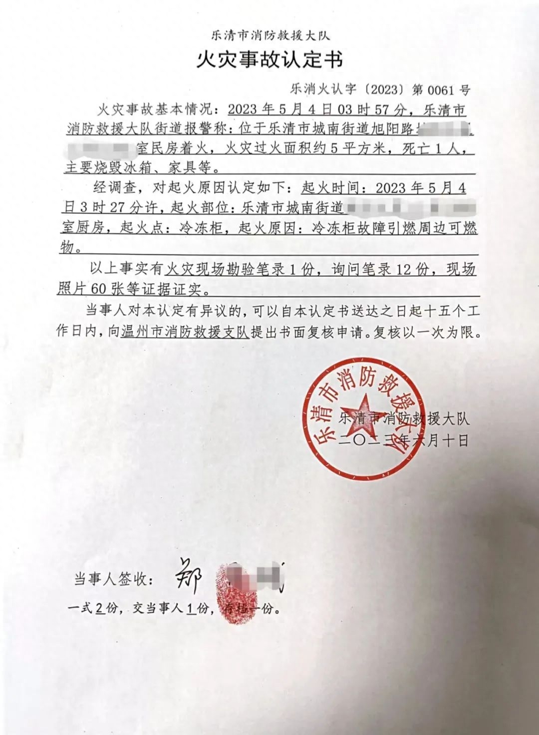 消防部门出具的事故认定书 (来源:温州晚报)