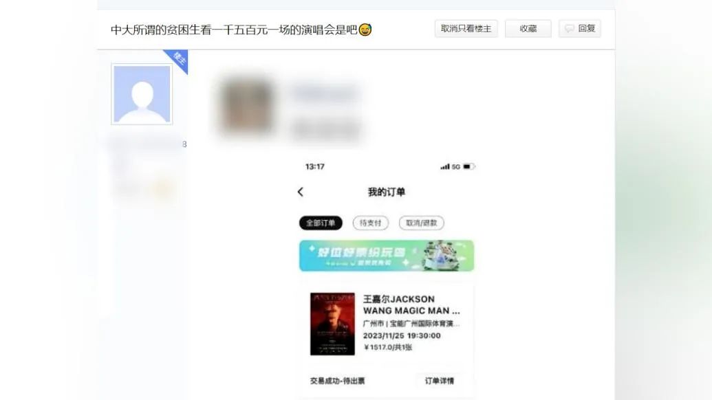 中山大学贴吧网友发文称特困生买1500元演唱会门票(网页截图)