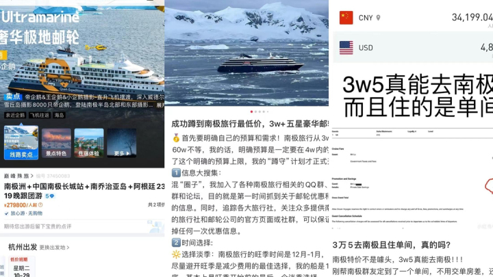 杭州姑娘张媛(化名)便是其中之一。在小红书输入“南极旅游”,她看到跳出30000余条笔记。根据“前辈”经验,需要提前一年准备。她加入了各种与南极旅游相关的QQ群、微信群,目的是秒抢游轮折扣。