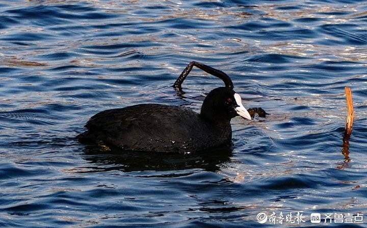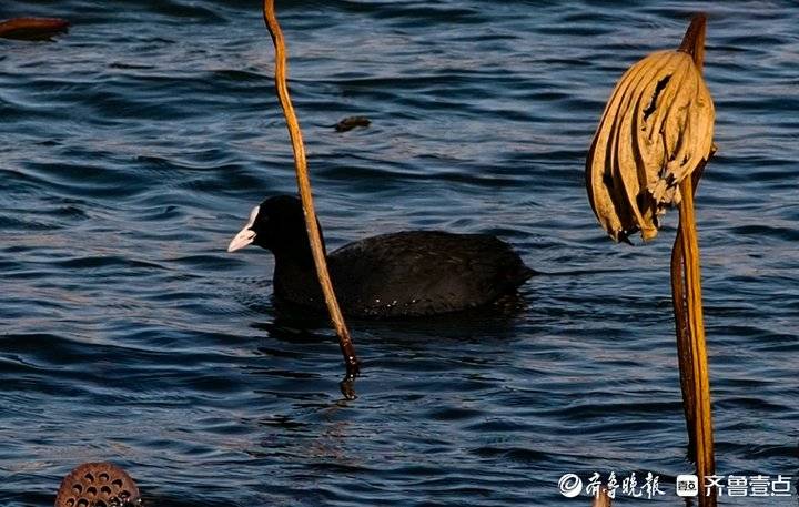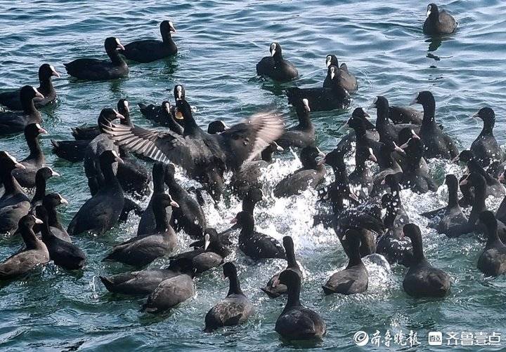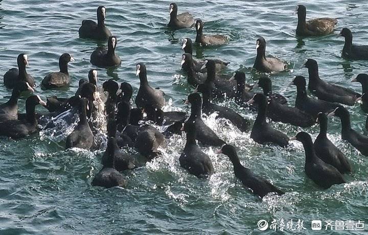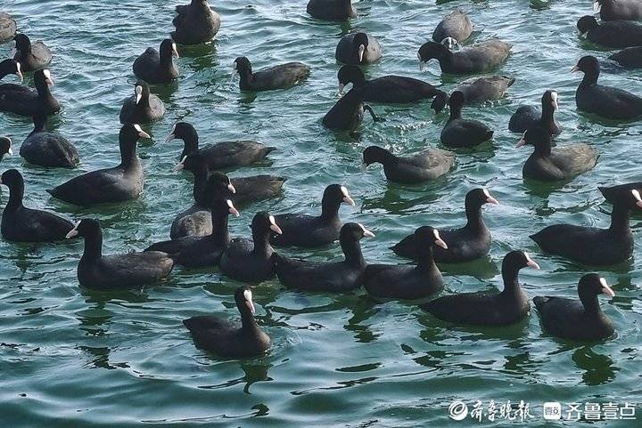 大群白骨顶鸡在湖西侧和游客互动,现场气氛热烈。白骨顶鸡是鹤形目秧鸡科骨顶鸡属中型游禽。这种鸟类因其头上特殊的白色额甲而得名,是一种十分引人注目的鸟类。