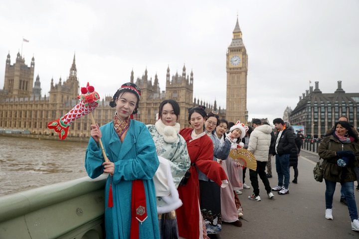 2月25日,汉服爱好者在英国伦敦大本钟前展示汉服,他们还向当地民众和游客介绍中国春节,宣介中华传统文化。(李颖摄)