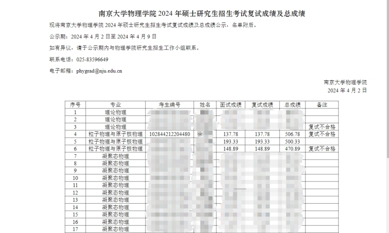 南京大学物理学院2024年硕士研究生招生考试复试成绩及总成绩。图/南京大学物理学院