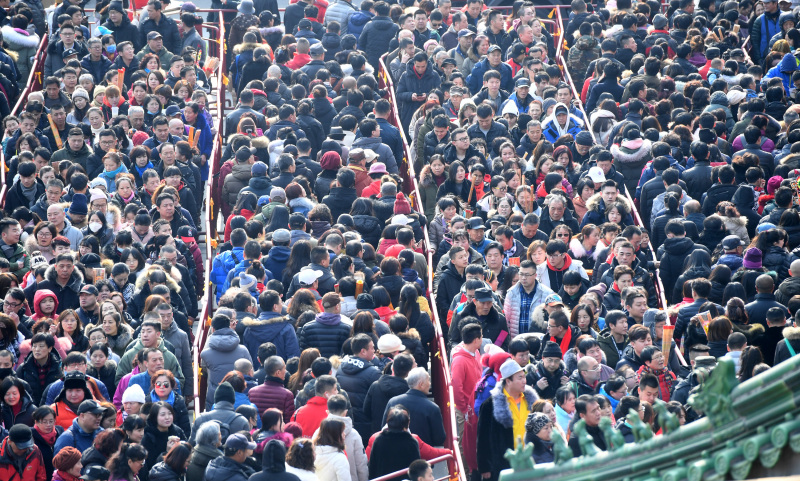 ▲2019年春节“黄金周”期间,游客在北京八大处公园内排队祈福。图/新华社