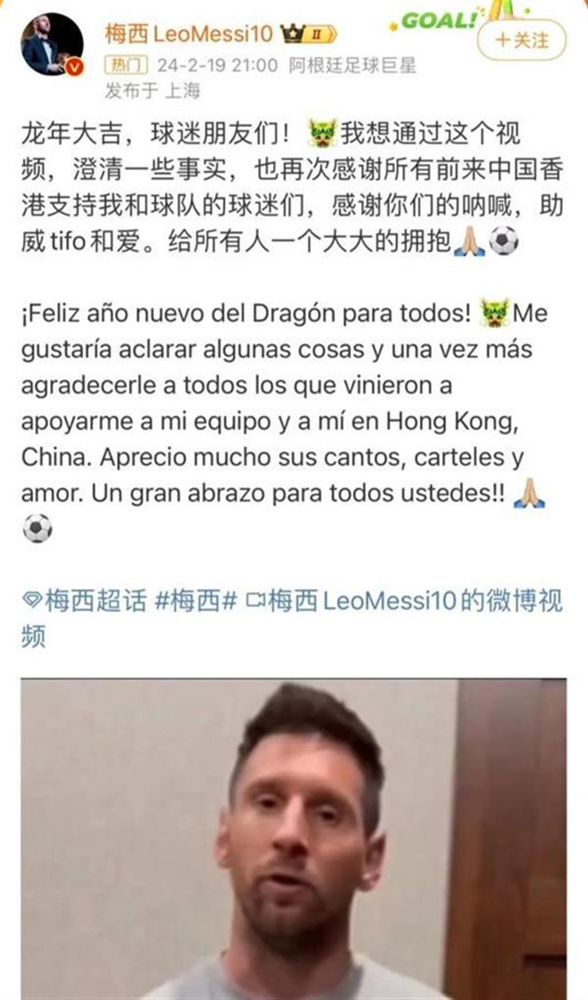 梅西回应在香港的比赛未能上场(图片来源:微博截图)