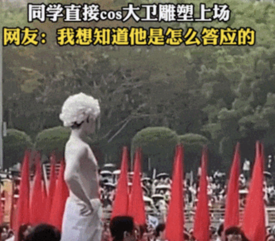 不仅北大,全国各高校的大学生都在绞尽脑汁用自己的专业“整活”:宠物科技学院的学生牵来猫猫狗狗上演动物表演,还有人负责铲屎;土木专业的学生装扮成愚公带着一家老小移山,走在最前头的则是个风水先生;临床医学生抬着担架狂奔,尽显急救常态;美术学院的学生cos大卫雕塑上场……可以说只有你想不到,没有大学生们做不到的。