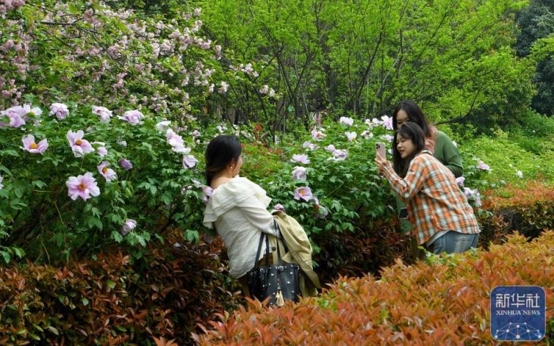 ▲4月2日,游客在洛阳隋唐城遗址植物园内赏花拍照。图/新华社