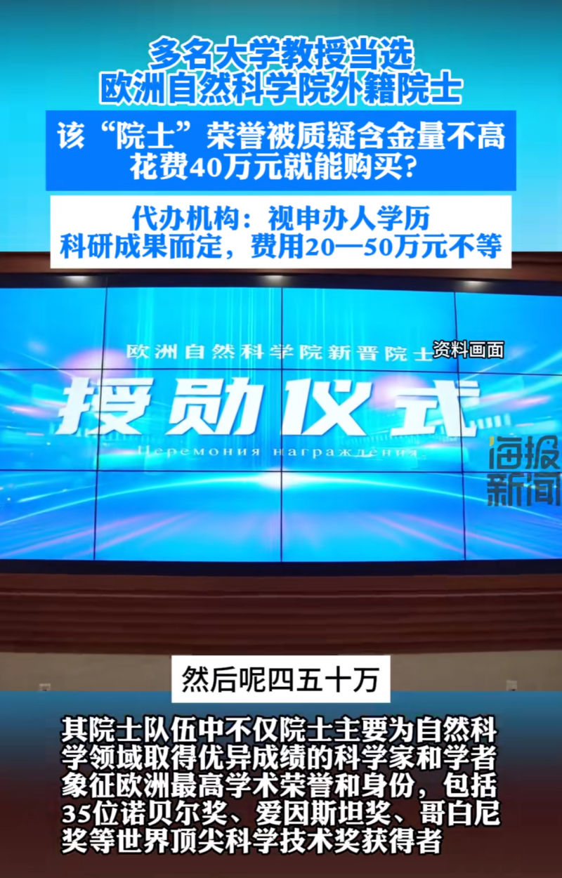 据海报新闻报道,多家高校、医院、医药公司发文祝贺本单位有人当选为“欧洲自然科学院”外籍院士,引发了社会关注。有质疑称,该“外籍院士”头衔含金量不高,花40万元就能买到。