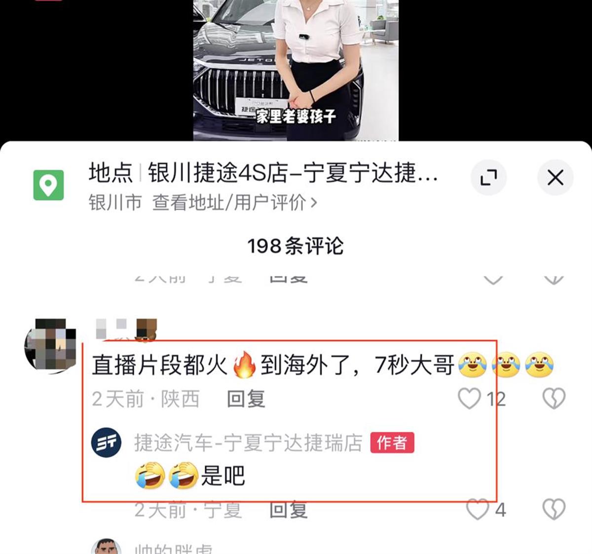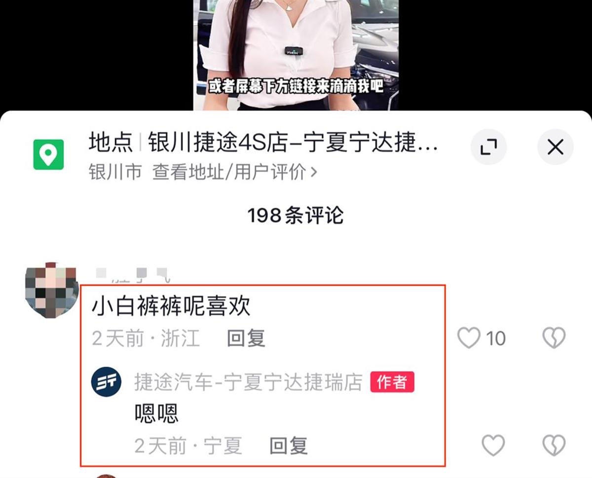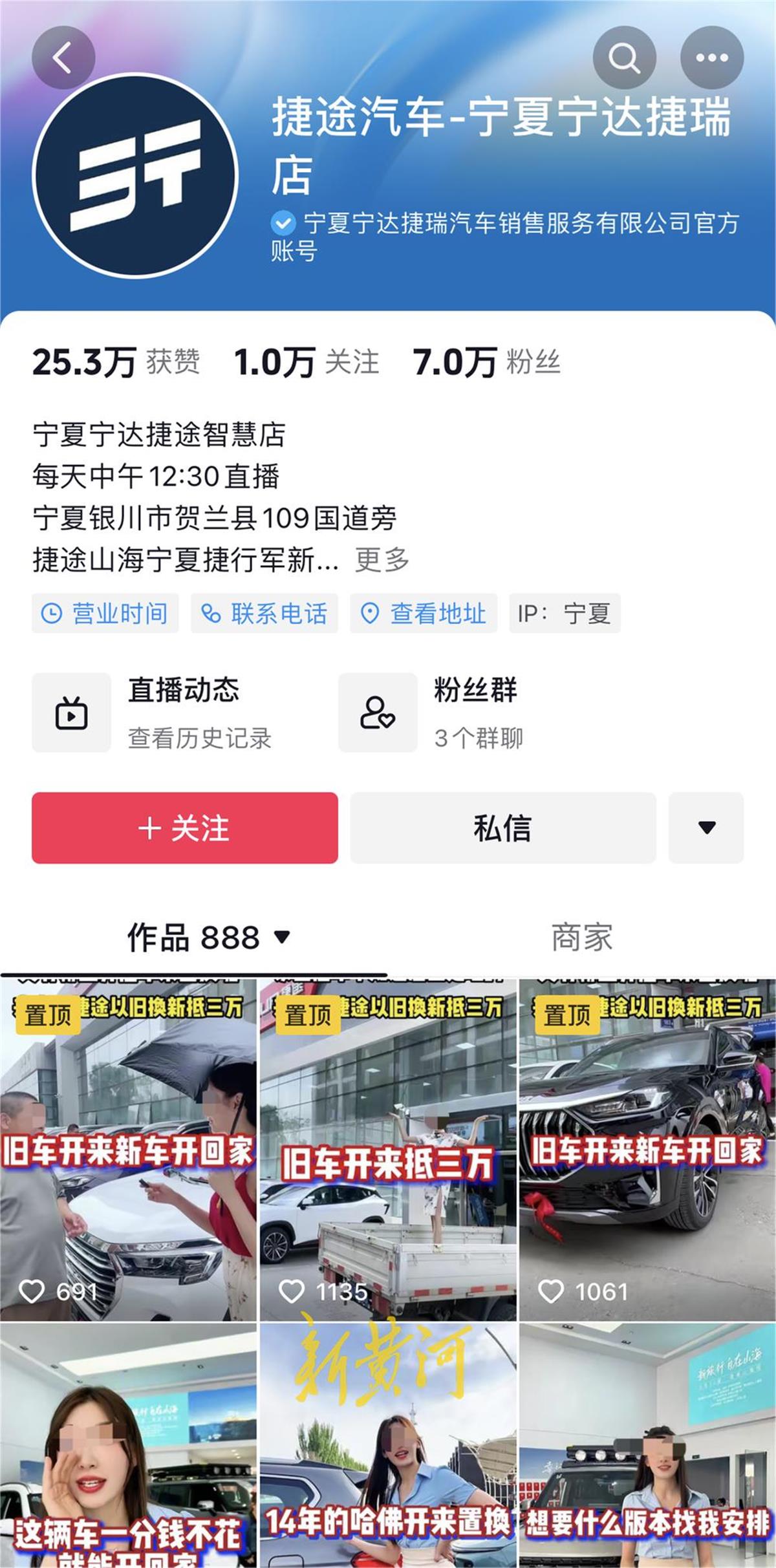 视频中的女主播自称“冰冰”,经常在某短视频平台账号“捷途汽车—宁夏某店”出镜,网上流传的不雅视频疑似出自该账号的直播。捷途汽车官方客服一名工作人员证实涉事门店系旗下经营商。表示将向公司相关部门进行反馈,并争取尽快回复。但截至发稿前,记者未能收到任何反馈。(据5月14日新黄河客户端)