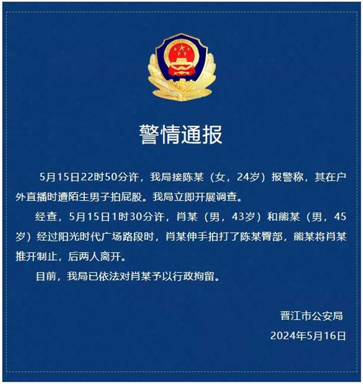 当日晚间,晋江市公安局发布警情通报表示,5月15日22时50分许接到24岁的女子陈某报警称,她的户外直播时遭陌生男子拍屁股。经查,5月15日1时30分许,肖某(男,43岁)和熊某(男,45岁)经过阳光时代广场路段时,肖某伸手拍打了陈某臀部,熊某将肖某推开制止,后两人离开。目前,警方已依法对肖某予以行政拘留。(据5月17日北京日报)