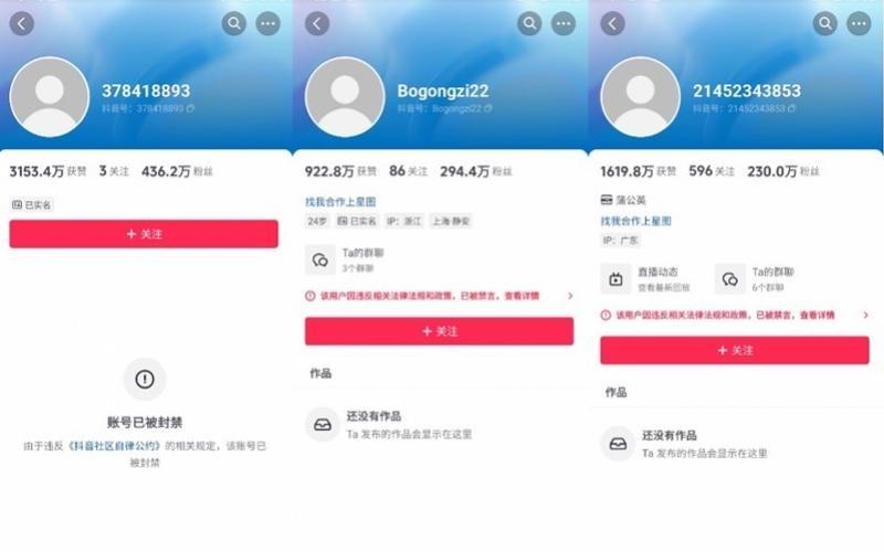 ▲王红权星、柏公子、鲍鱼家姐账号被封禁和禁言。图/社交平台截图