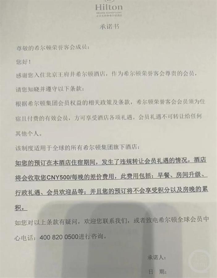 酒店要求住客签署的承诺书(图片来源:受访者供图)