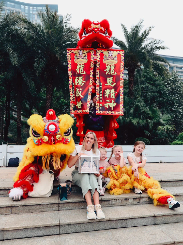 克里斯夫妇带着3个孩子在珠江边学习舞狮。图源 广州日报微信