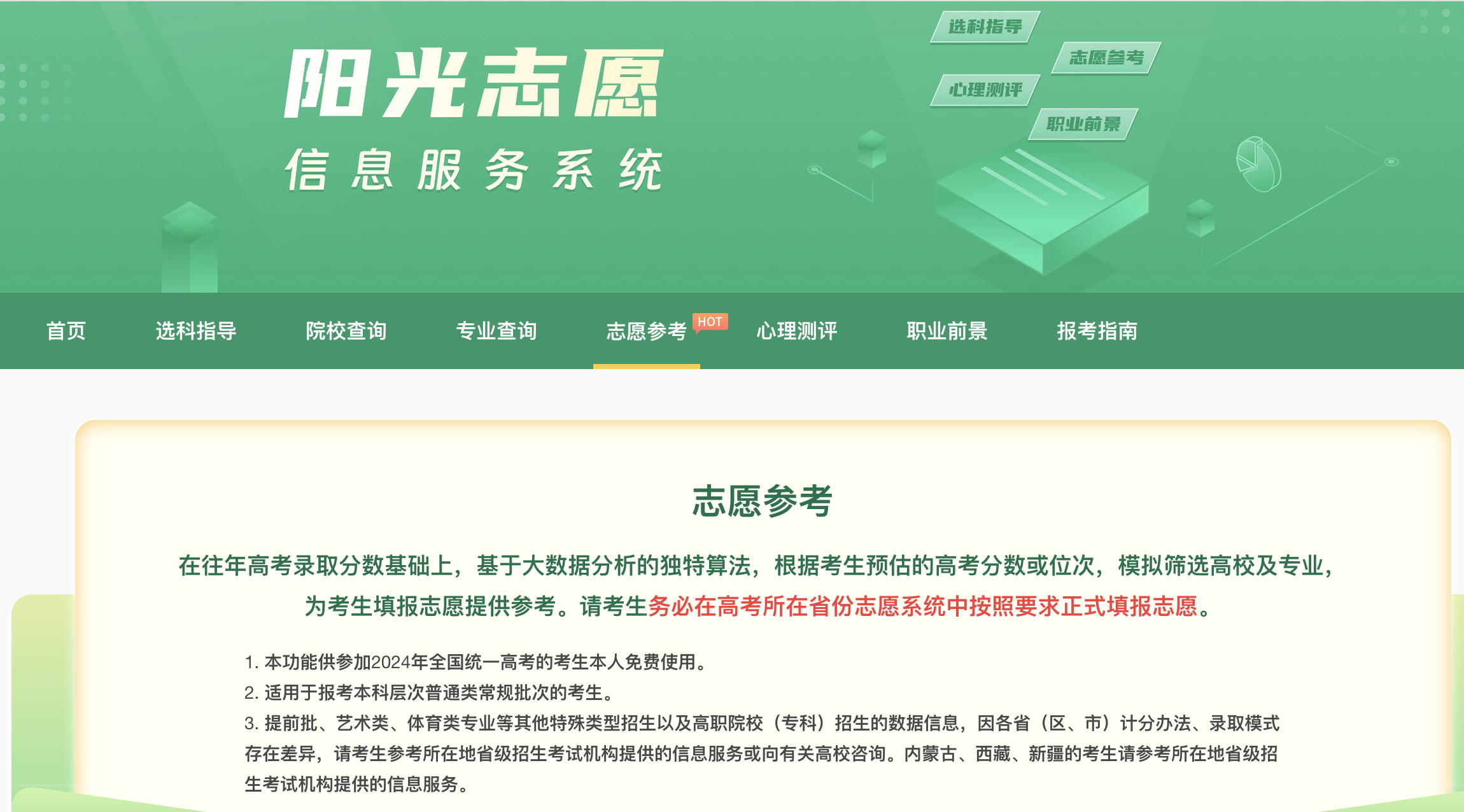 为进一步加强对考生的志愿填报服务,落实国务院“高效办成一件事”的决策部署,2024年,教育部“阳光高考”信息平台面向高考生免费开放“阳光志愿”信息服务系统,基于招生、就业、调查、测评等大数据,结合深度专业和职业解读,提供志愿推荐、专业介绍、心理测评、就业去向及前景查询等服务。