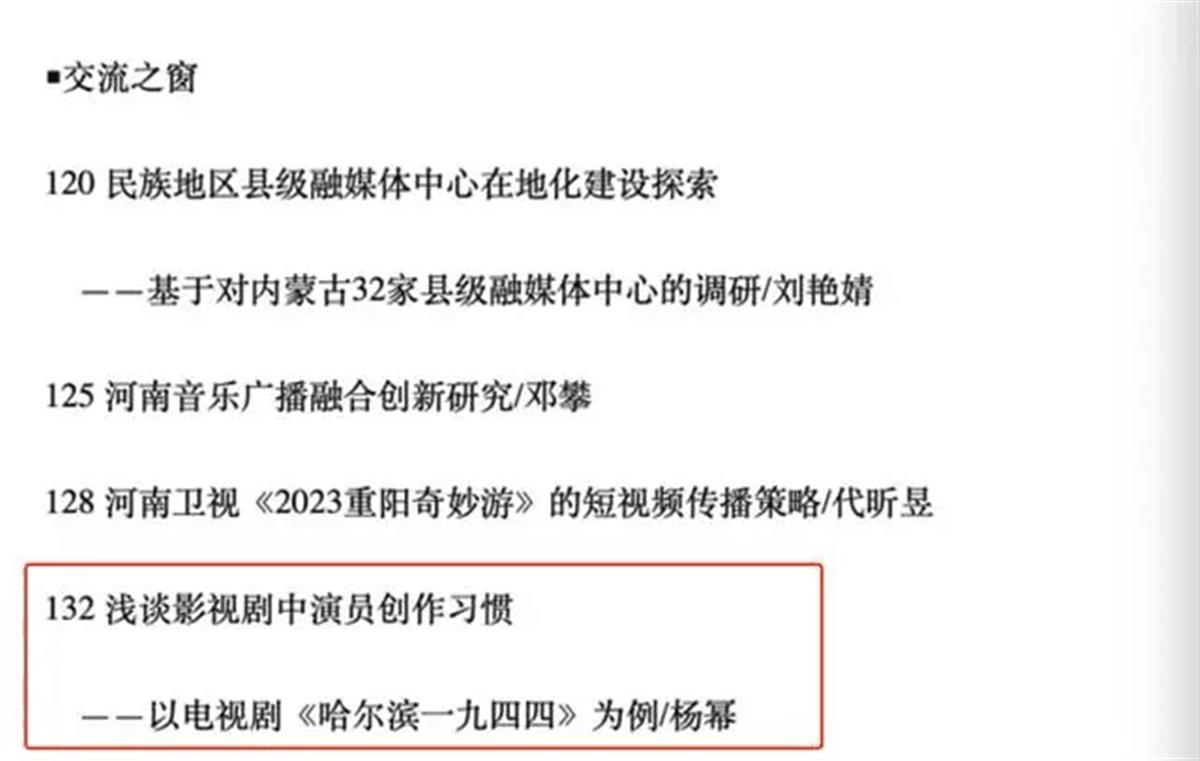 引发关注的这篇文章为《浅谈影视剧中演员创作习惯——以电视剧〈哈尔滨一九四四〉为例》,刊发于《中国广播电视学刊》(CSSCI扩展版、北大中文核心)2024年第六期,作者署名为“杨幂”。经查证,上述文章作者为知名影视演员杨幂。