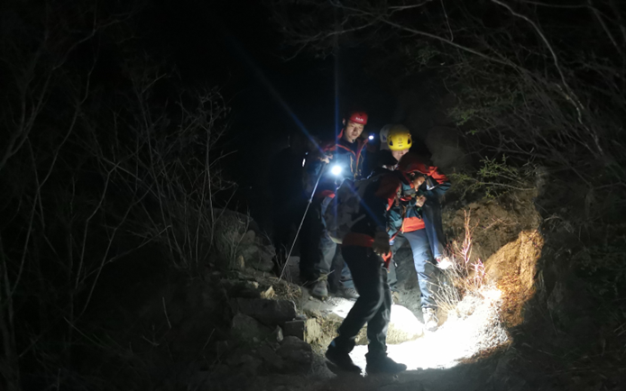 ▲资料图:4月4日,北京市怀柔区消防救援支队桥梓消防站救援人员背着受伤“驴友”下山。图/怀柔区消防救援支队