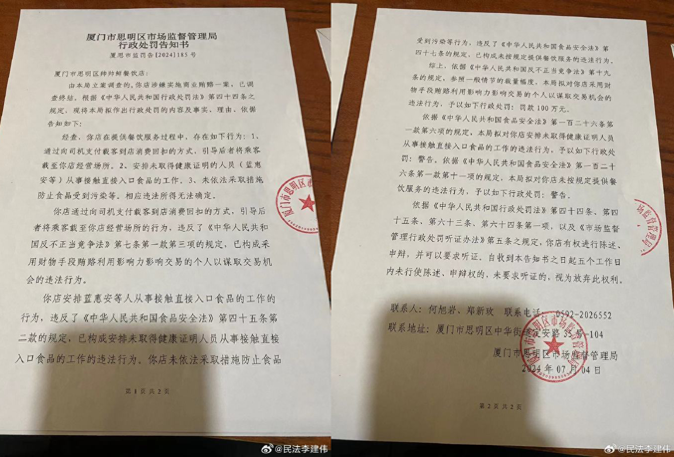 7月16日,厦门思明区市场监督管理局中华所一名工作人员向潇湘晨报确认了这份处罚告知书,并称如果商家对此有疑义,可以申请复议或者诉讼。该店负责人表示,对于上述“罚单”会进行申诉。