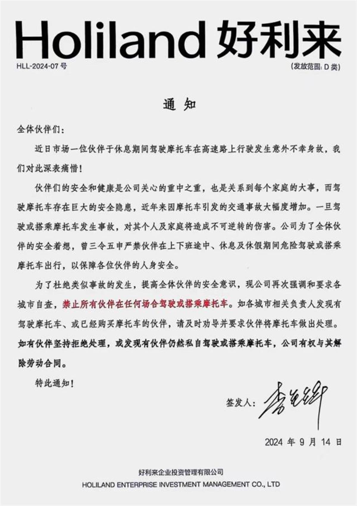 9月14日,社交平台上流传一张好利来禁止员工在任何场合驾驶或搭乘摩托车的通知截图。该通知显示,近日,好利来一位员工于休息期间驾驶摩托车发生意外不幸离世。公司因此发布规定,如果有员工仍私自驾驶或搭乘摩托车,公司有权与其解除劳动合同。
