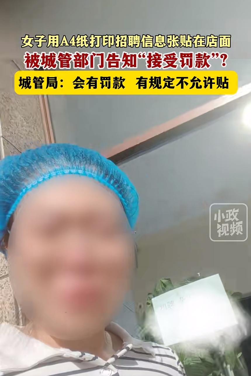 近日,一段视频在网上热传。一位女子哭诉称,她在自家店铺玻璃门上贴了一张A4纸(做月子餐生意的店铺招杂工),“有一个部门给我打电话:要我拿着身份证去他们那里接受处罚;不去的话,就要封了我的手机号。”起先,内蒙古兴安盟乌兰浩特市城管部门在回应媒体时表示:“会有罚款”,在自家玻璃上贴A4纸广告也是不允许的。