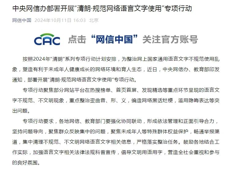 近日,中央网信办、教育部印发通知,部署开展“清朗·规范网络语言文字使用”专项行动。专项行动聚焦部分网站平台在热搜榜单、首页首屏、发现精选等重点环节呈现的语言文字不规范、不文明现象,重点整治歪曲音、形、义,编造网络黑话烂梗,滥用隐晦表达等突出问题。