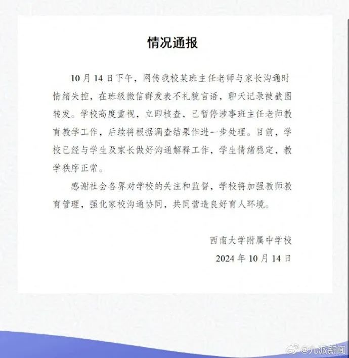 据媒体报道,10月14日,重庆西南大学附属中学班主任徐某某疑似情绪激动,在班级群怒骂“都给老子滚”,相关聊天记录在社交平台传播后,迅速引起舆论关注。不少网友将矛头直指涉事班主任。班主任所在的中学也给出公开回应:目前已经暂停了徐某某的教育教学工作,后续将根据调查情况进一步处理。