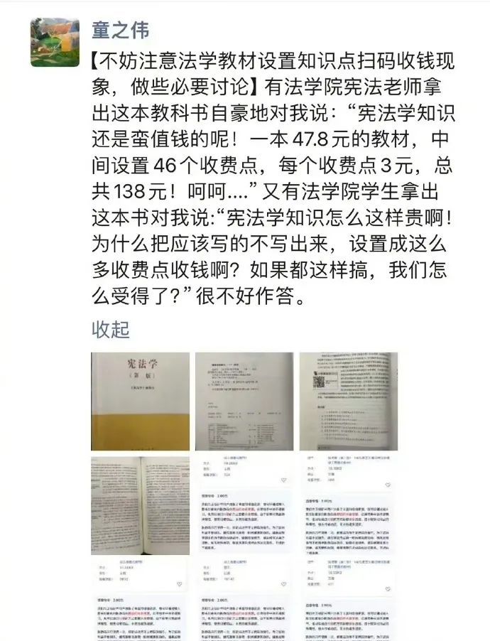 近日,有教授发文称,高校法学教材《宪法学》内印有不少二维码,扫码后需要付钱才能获取相关信息,此事引发关注,相关话题也登上热搜。