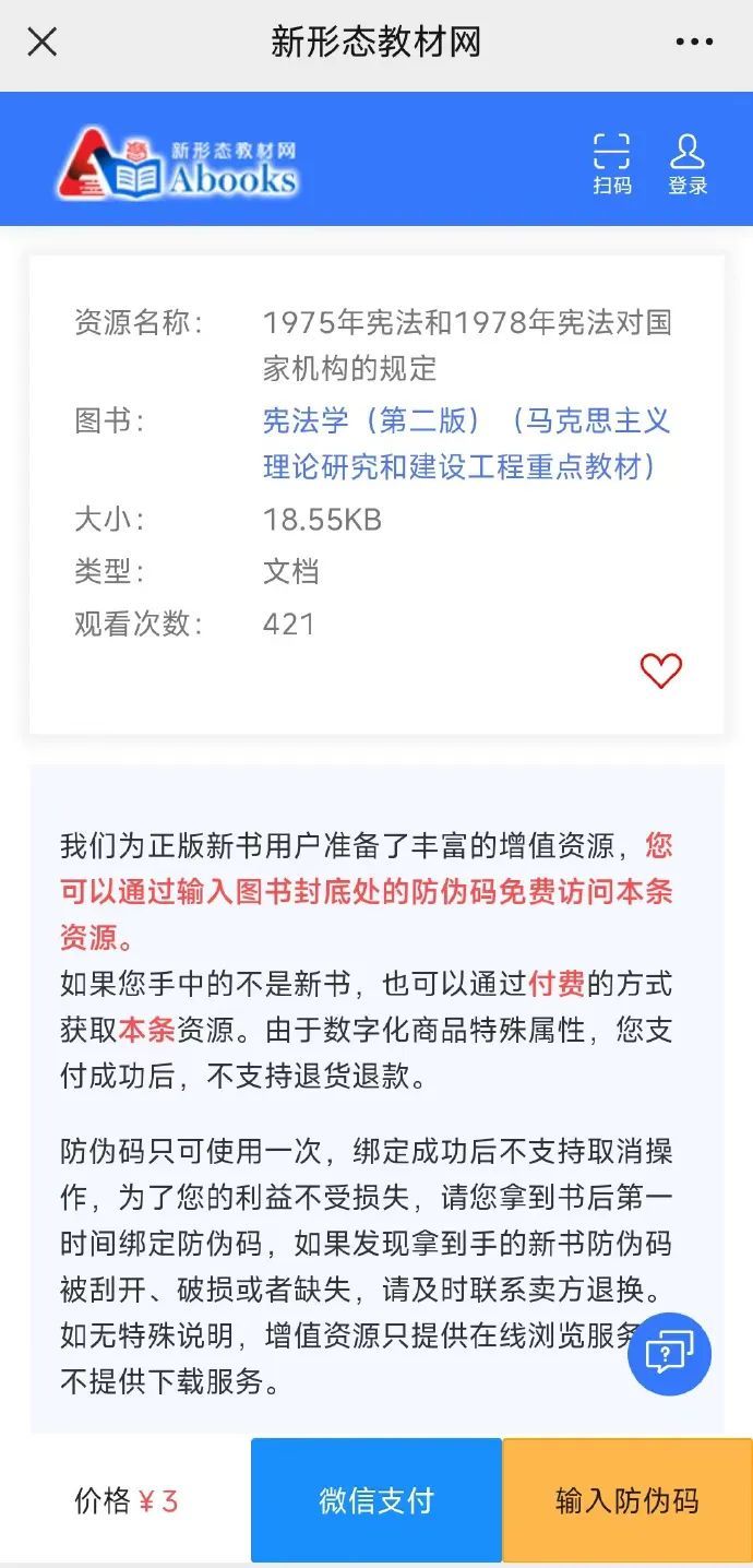 据10月16日报道,记者扫码登录发现,链接转至新形态教材网,界面所附文字解释称,我们为正版新书用户准备了丰富的增值资源,您可以通过输入图书封底处的防伪码,免费访问本条资源。如果您手中的不是新书,也可以通过付费的方式获取本条资源。显示的支付价格是3元。