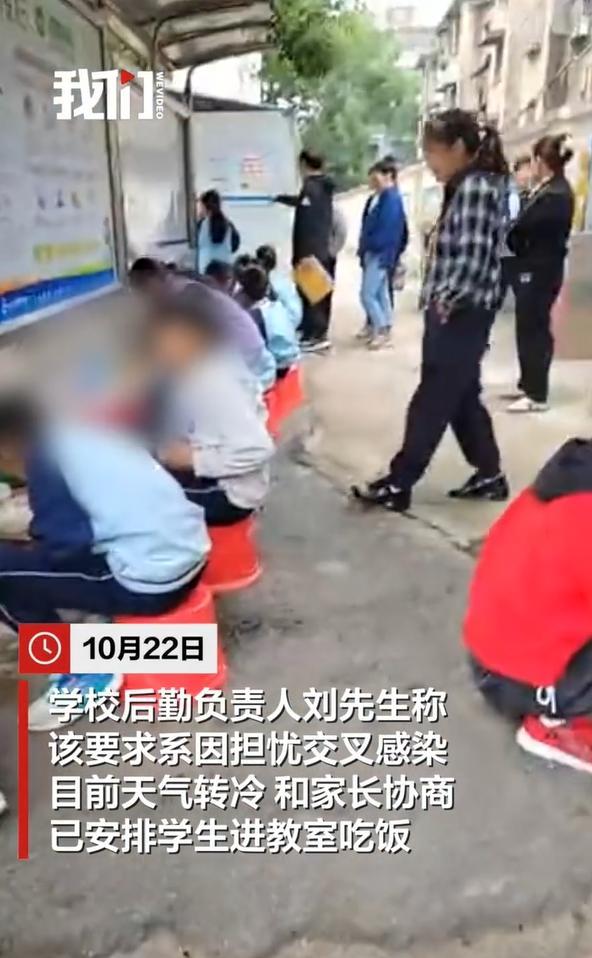 据新京报报道,该校后勤负责人对此称,此前让自带饭学生在教室外面吃饭,是怕交叉感染。目前天气转冷,经和家长协商已安排学生进教室吃饭。另有校方人员回应,校门口有给学生配椅子,但没想到学生数量突然增多,出现了趴在地上吃饭的情景。