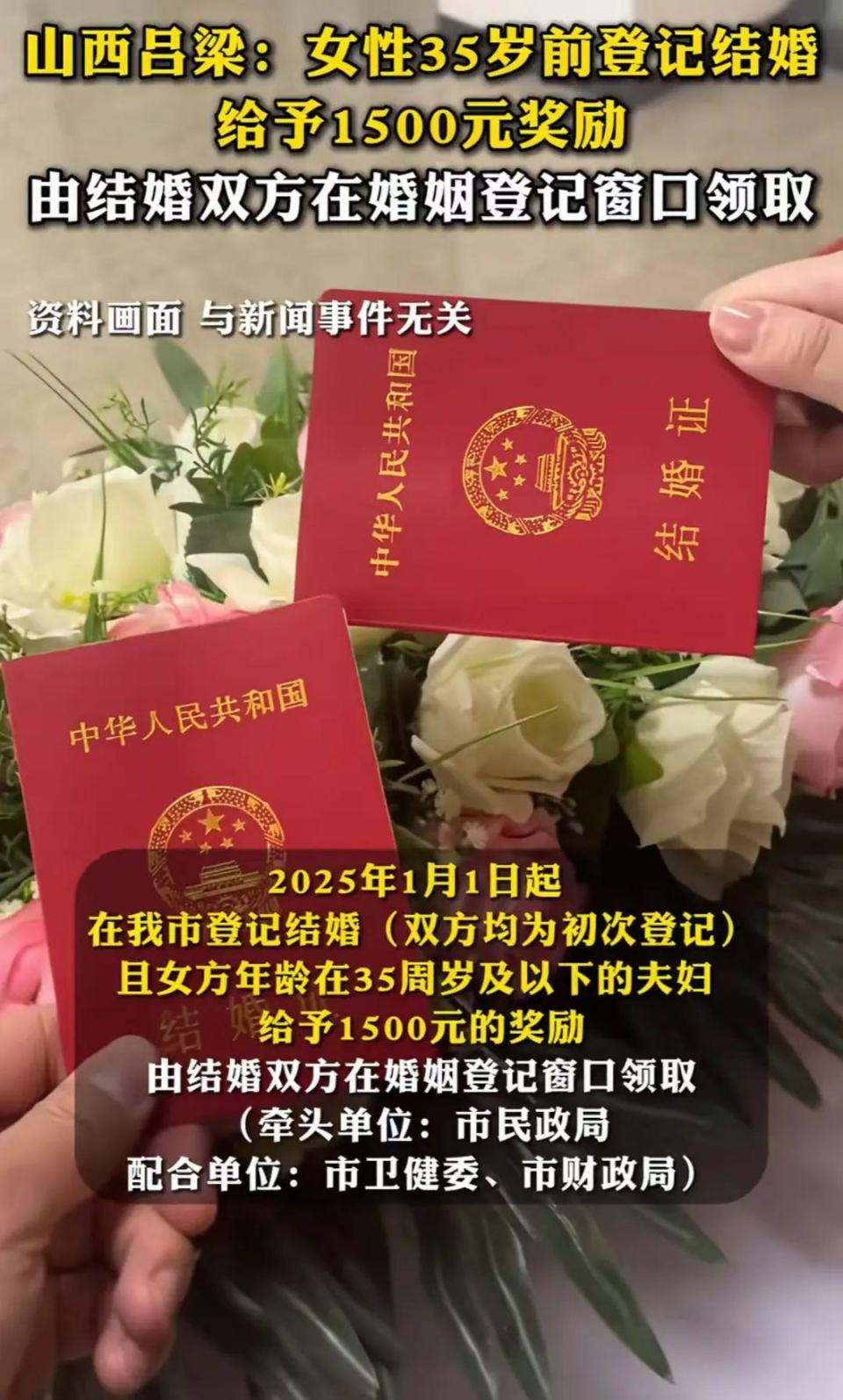 真金白银的生育支持又来了。10月30日,《吕梁日报》刊发了《关于完善生育支持政策体系建设生育友好型社会的若干措施》,从做好青年婚恋服务、鼓励适龄青年结婚、加强妇幼健康服务、推进“出生一件事”联办等9个方面建立生育友好型社会。其中,在“鼓励适龄青年结婚”方面,《措施》提出:2025年1月1日起,在吕梁市登记结婚(双方均为初次登记)且女方年龄在35周岁及以下的夫妇,给予1500元的奖励,由结婚双方在婚姻登记窗口领取。