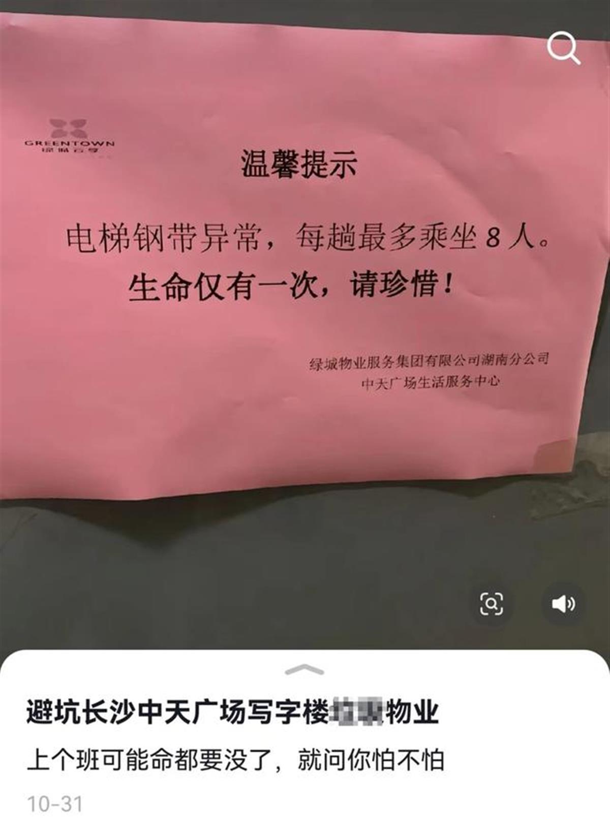 10月31日,一网友在网络平台发贴称,长沙中天广场写字楼的物业在电梯旁贴了一个温馨提示:“电梯钢带异常,每趟最多乘坐8人”,并用加粗字体写着“生命仅有一次,请珍惜”,这令她感到不适,“就问你怕不怕?”