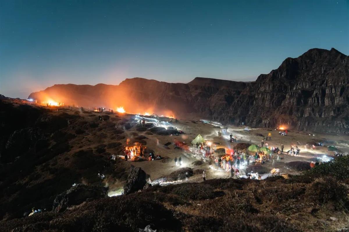 夜爬大牯牛山的游客燃起团团篝火(图源:上游新闻)
