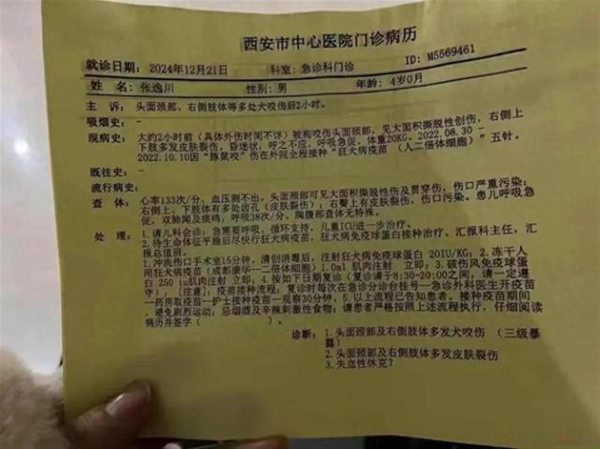 12月21日下午,西安市灞桥区豁口村发生一起恶犬伤人事件。4岁男童张逸川在村口附近玩耍时,被两只恶犬袭击。目前孩子在西安市儿童医院ICU中心治疗。