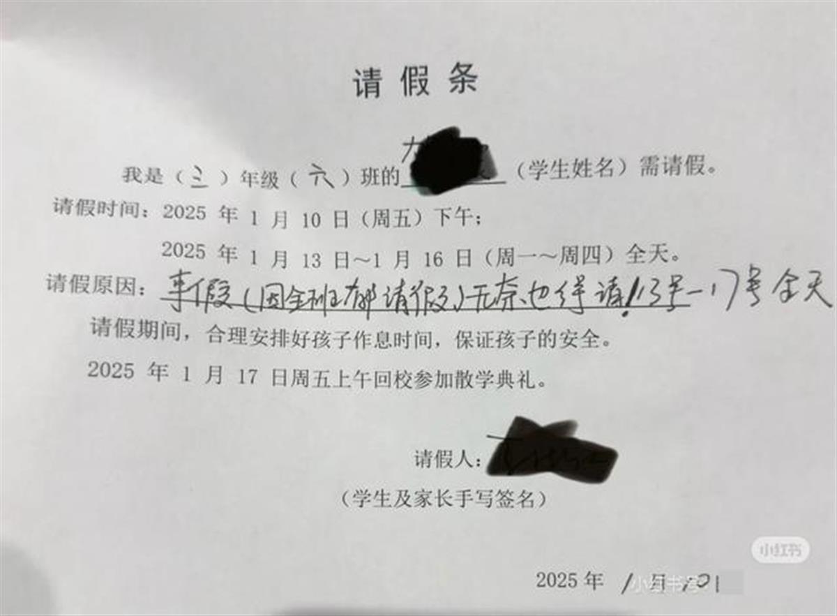 此前就有一名家长在社交平台晒出给学校的请假条,在请假原因一栏,该家长手写了“事假(因全班都请假了无奈也得请13号-17号全天)”,据悉,该学校的期末考试在1月10日上午结束,也就是说,假前教育周因全班请假沦为虚设。