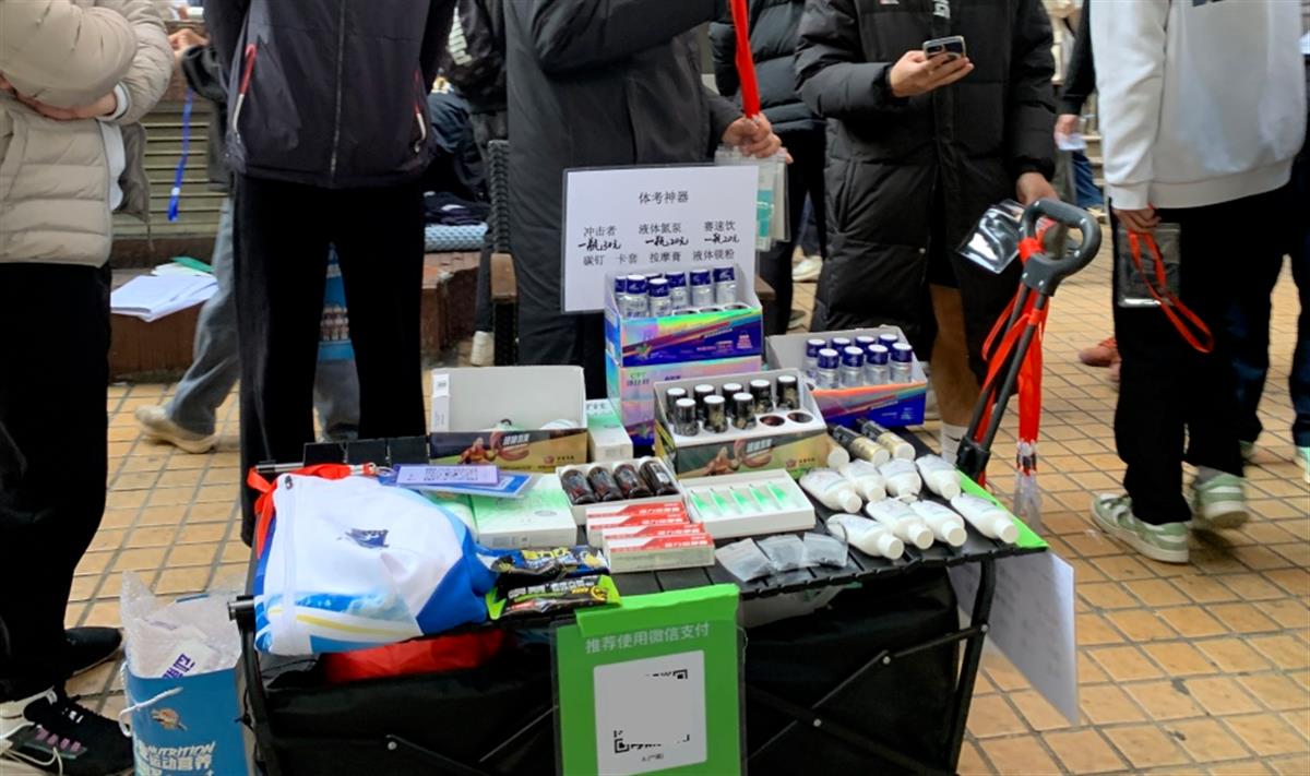 这些摊贩公然摆卖号称“体考神器”“体考黑科技”的饮用品和食品,声称能够瞬间提高考生的力量和兴奋度,让体考成绩跨越一个等级。这些“神器”“黑科技”的标价都不贵,单价在10元至30元之间,有摊贩表示:“销路好得很,这几天在考场外卖了好多了。”