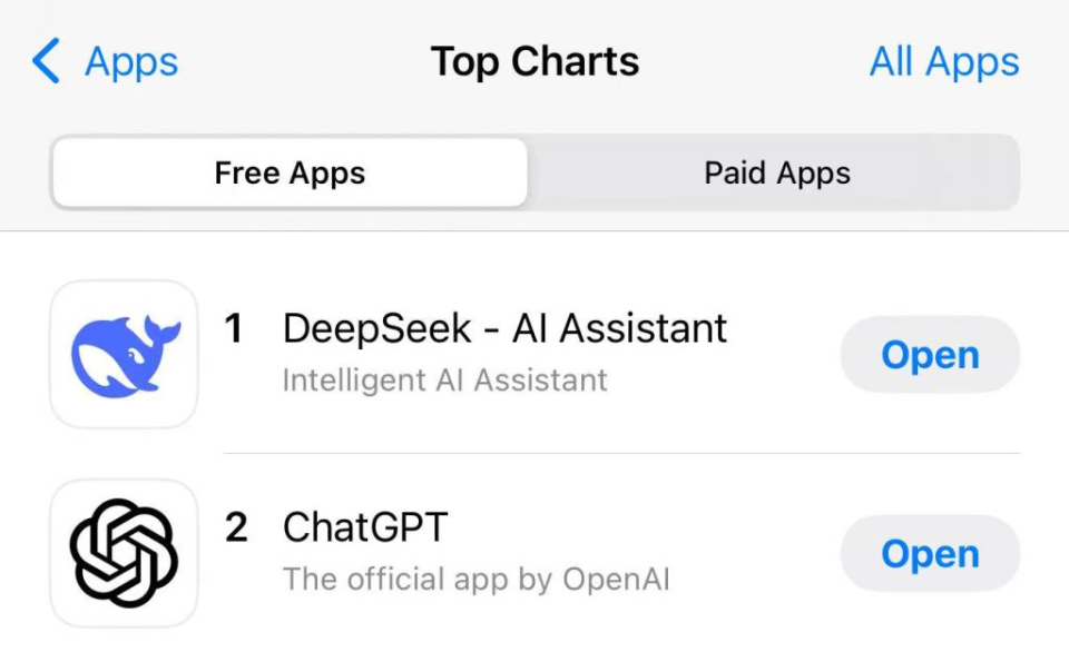 近段时间,中国国产大模型DeepSeek持续引发业内震动。据报道,1月27日,DeepSeek应用登顶苹果中国地区和美国地区应用商店免费APP下载排行榜,在美区下载榜上超越了ChatGPT。