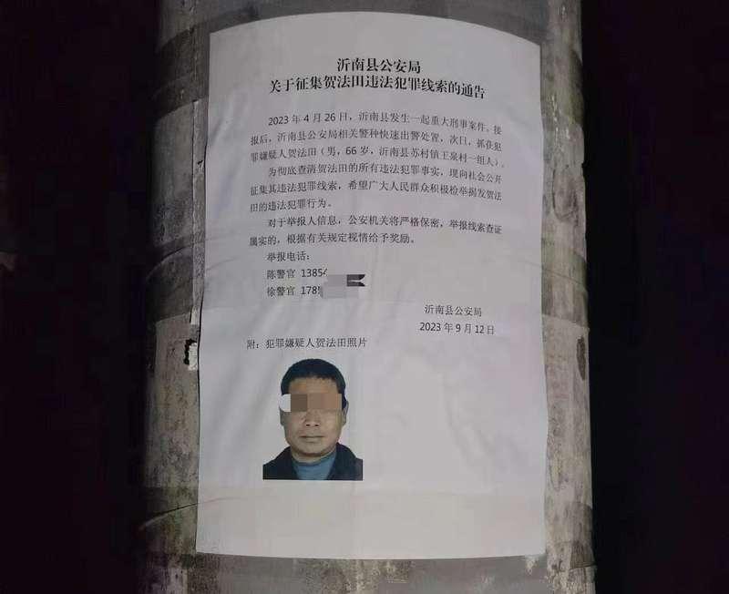 ↑此前凶案发生后,沂南县公安局发布的关于征集贺法田违法犯罪线索的通告。图据新京报