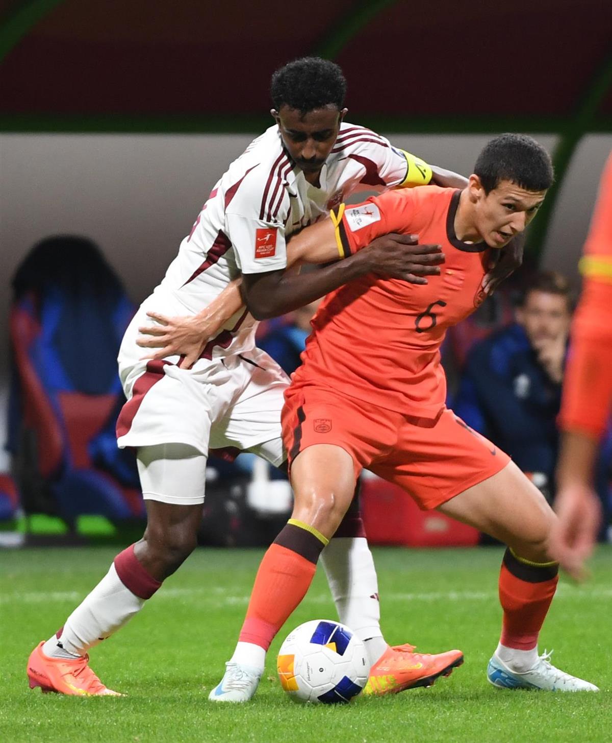 依木兰(右)在对阵卡塔尔的比赛中(图片来源:新华社)