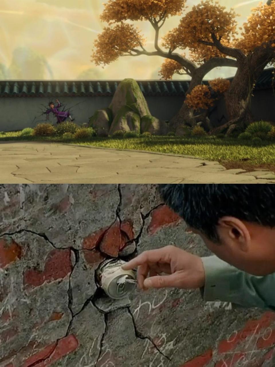 哪吒将毽子踢入墙体,以致围墙塌裂,正呼应了阿星将易拉罐踢飞,嵌入墙内,足球教练“吴孟达”抽出易拉罐时,一堵墙轰然破裂。
