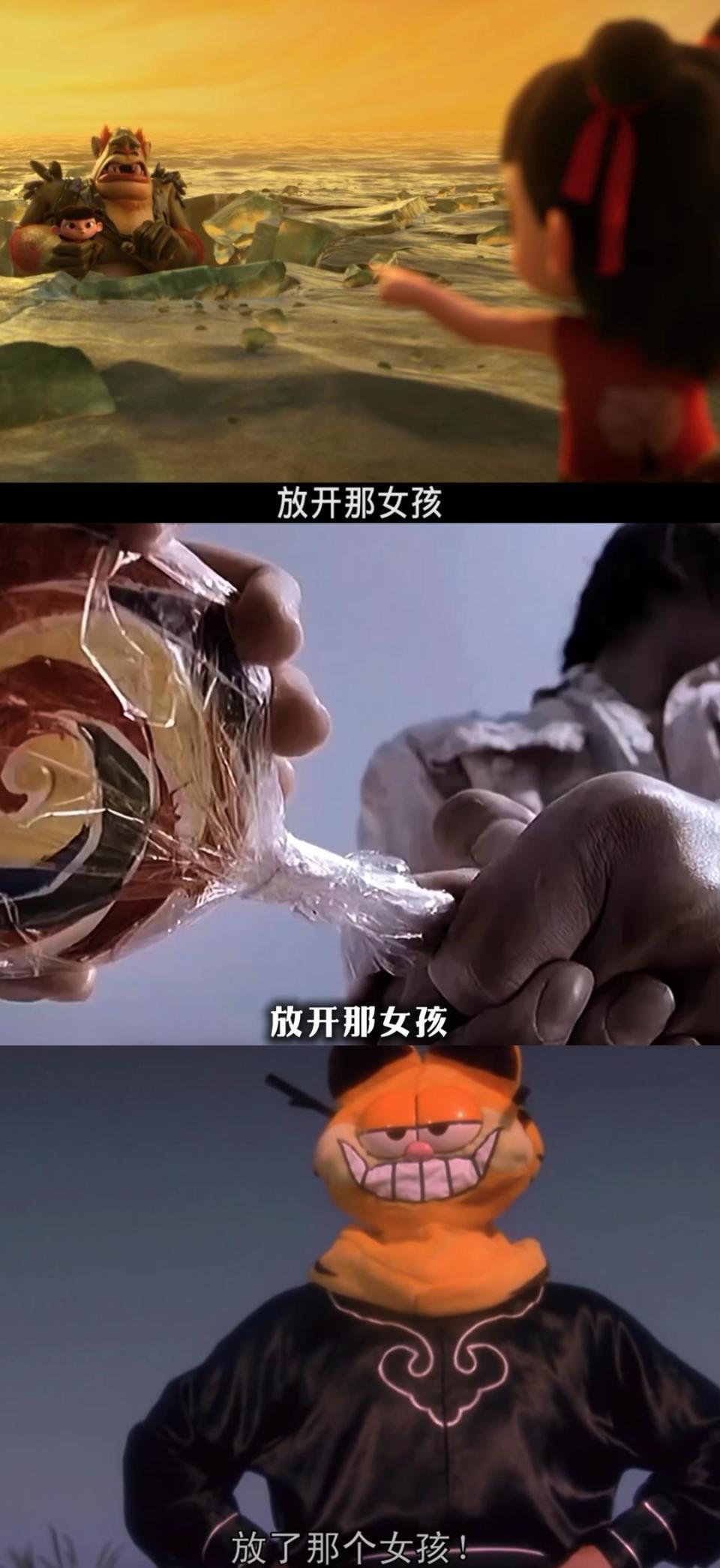 后来,哪吒学艺出山,抓捕泡泡怪,对他大喊:“妖怪,放开那个女孩。”