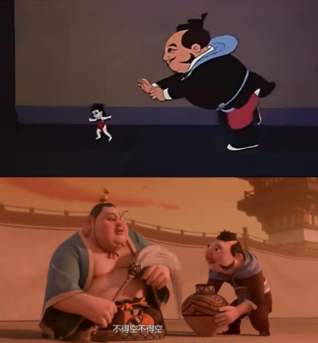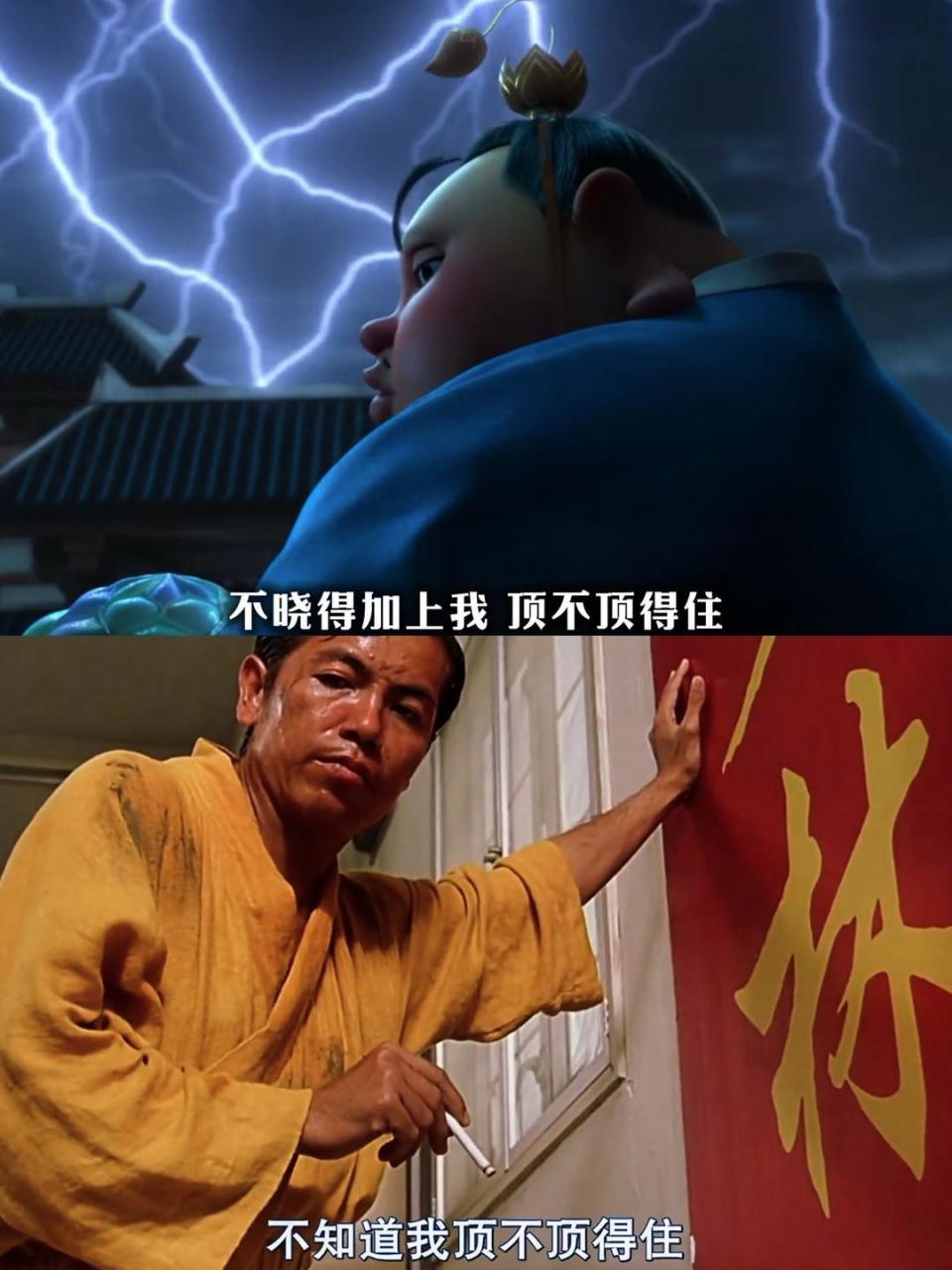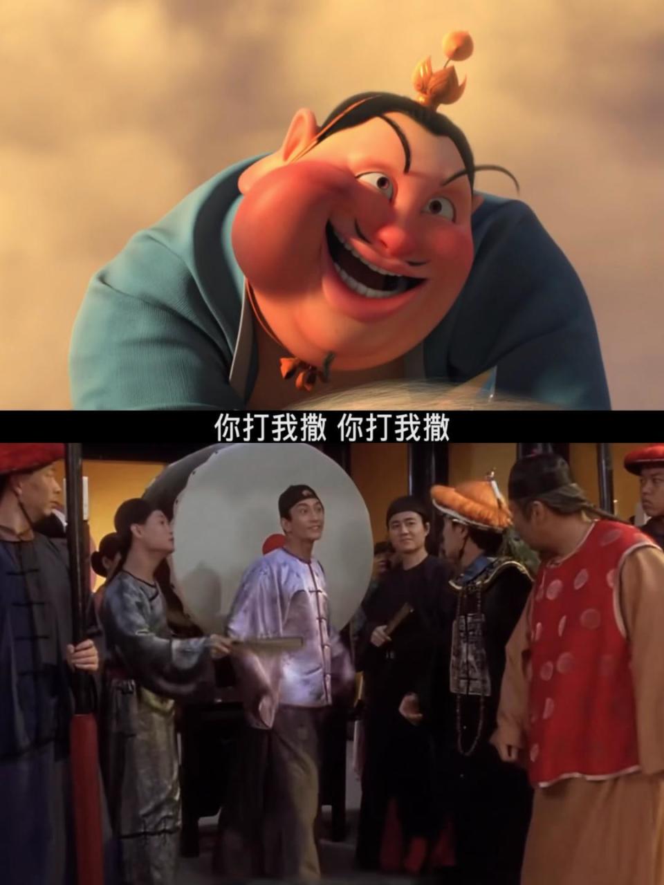《哪吒1》里还有村民群殴哪吒,像《功夫》里阿星乱斗斧头帮;渔叉误插中太乙真人的肩膀,也与阿星偷袭包租婆反被飞刀所伤一样;瞎眼老头乱认人,恰似《大话西游》变斗鸡眼的至尊宝;声线很“娘”的胡子大汉,颇得铁线拳师父、山匪“瞎子”及“如花”的神韵。