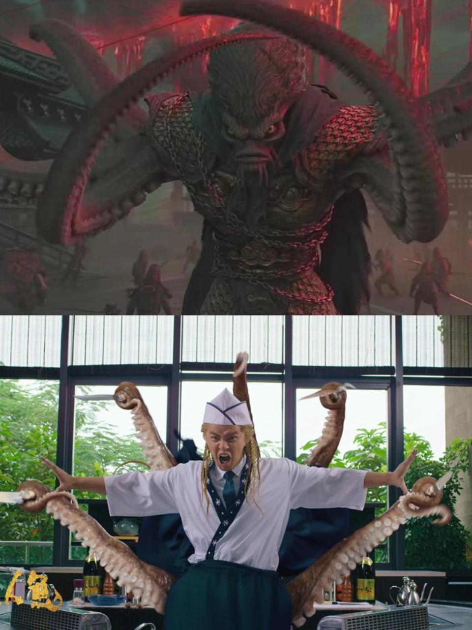 还有天元鼎内章鱼将军触手烧焦的搞笑画面,不正是《美人鱼》里的章鱼哥做铁板烧时“自残”的场景翻版吗?