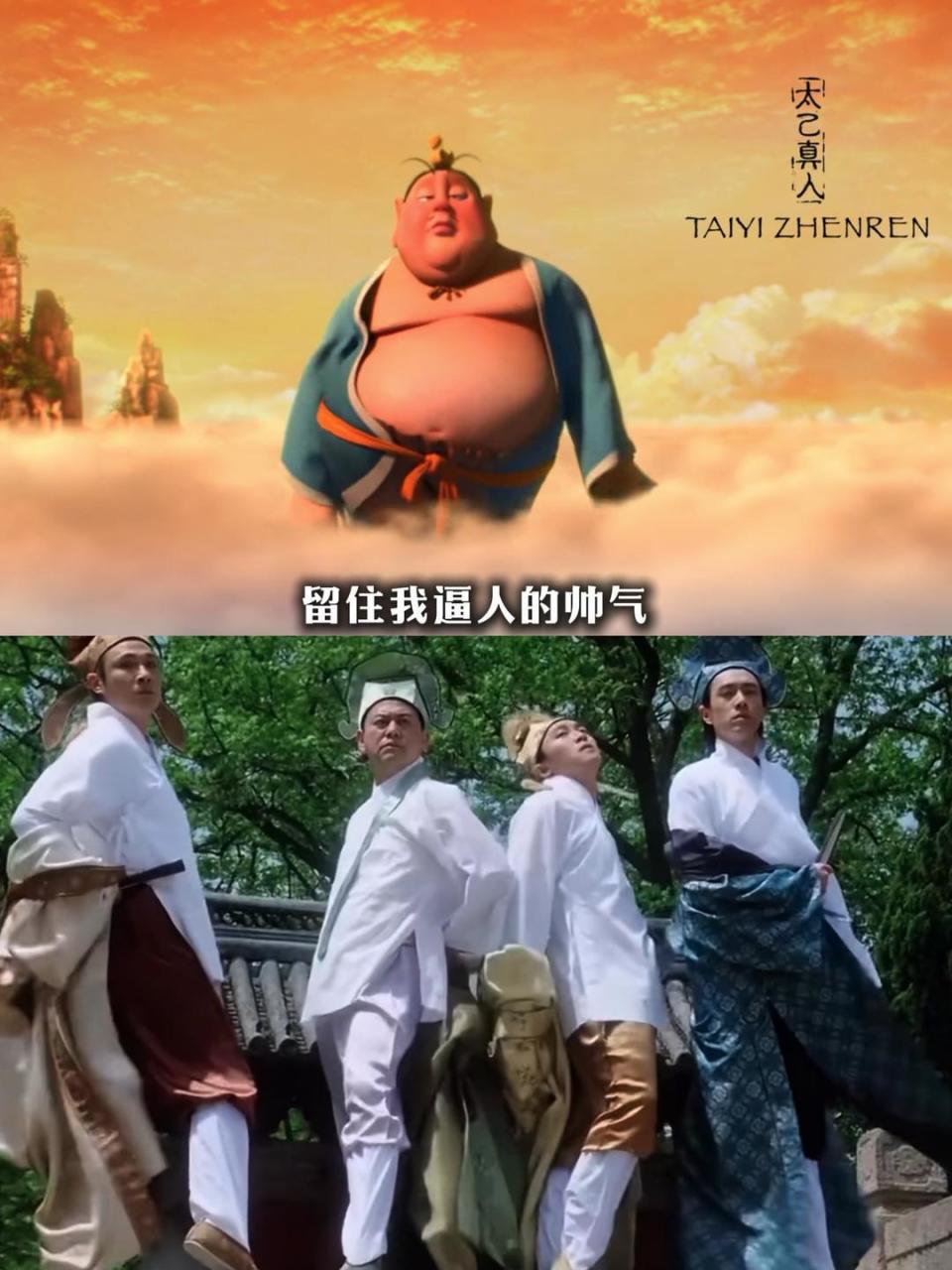 电影开篇,太乙真人以“逼人的帅气”登场,如模特走秀。这个出场,几乎复刻了《唐伯虎点秋香》开篇时,江南四大才子的拱桥走秀。
