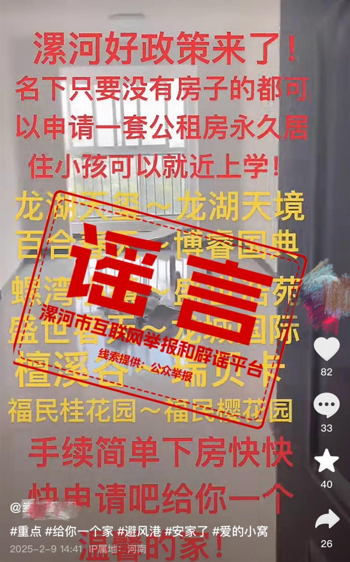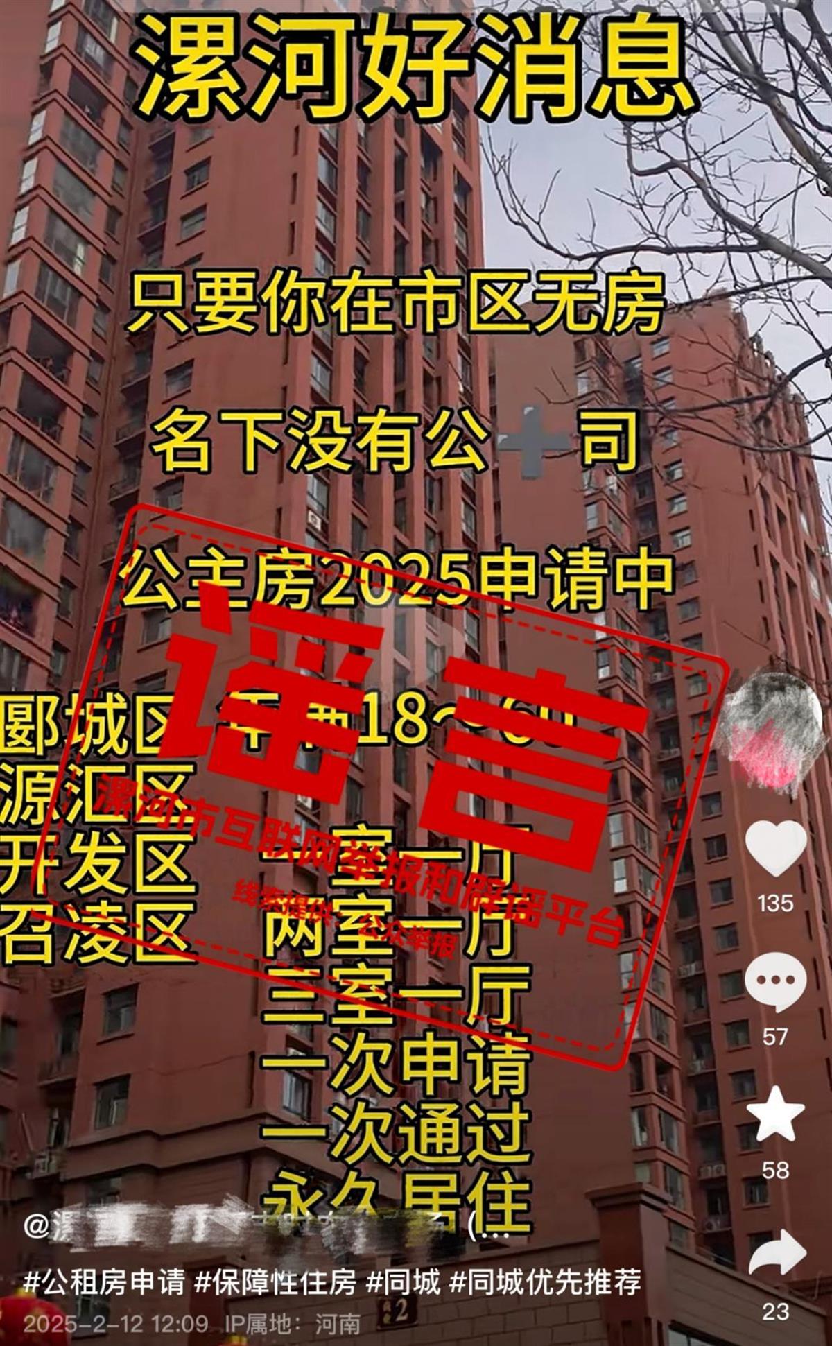 经向漯河市住房保障中心核实,以上内容均为虚假不实信息,是对漯河市公租房政策的歪曲理解和断章取义,以可获取房源为由诓骗广大市民,获取不当利益。(据2月20日河南日报)