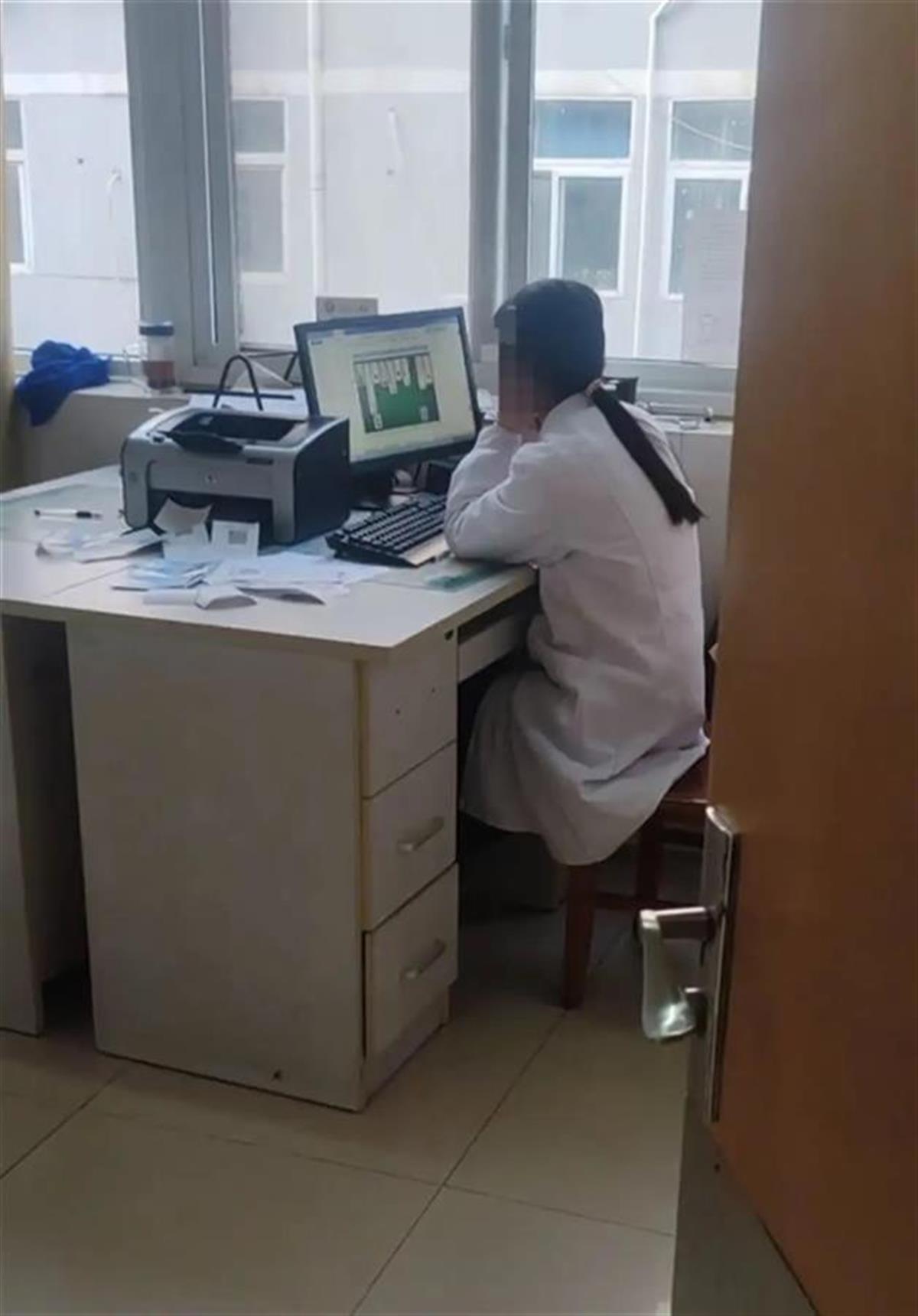 从网友爆料的视频中看出,有位身穿白大褂的年轻医生,左手托着腮帮,右手操作鼠标,面对着电脑,背对着患者。电脑上的纸牌游戏清晰可见,应该是玩了一会,也就是上班时间“摸鱼”了。虽然没有拍到正脸,但是可以看到这名医生的懒散,上班不在状态。全然不顾背后排队等待的患者,这一行为引发了网友的热议和不满。