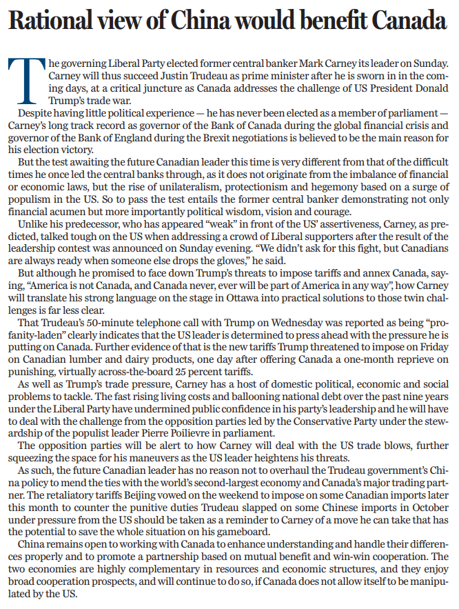 鉴于此,卡尼作为加拿大未来领导人,没有理由不对特鲁多政府的对华政策进行全面调整,以修复与世界第二大经济体、加拿大主要贸易伙伴中国的关系。中国商务部8日宣布,将于本月晚些时候对部分加拿大进口商品加征关税,以回应特鲁多政府去年10月在美国压力下对部分中国进口商品加征关税的歧视性措施。这应当成为卡尼的一个警示,他完全可以调整对华政策,为当前困境找到突破口。