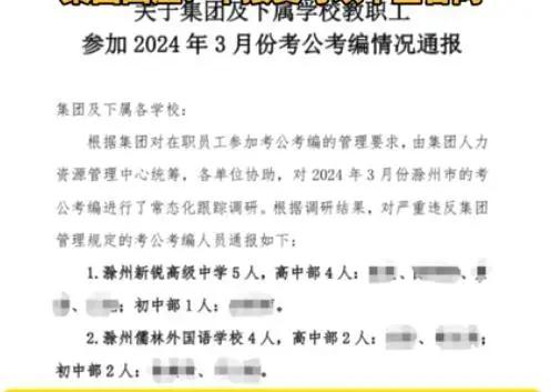 据荔枝新闻报道,日前安徽新锐教育集团旗下多所滁州学校的教师反映,入职时被要求签订“不参加考公考编承诺书”,且滁州市公务员或者事业编考试当天,学校会对符合考试条件的教师挨个打电话,或拉工作群开视频会议,没有及时回消息的教师,会认定为参加考公考编,将对参与考公考编人员进行处罚并通报。