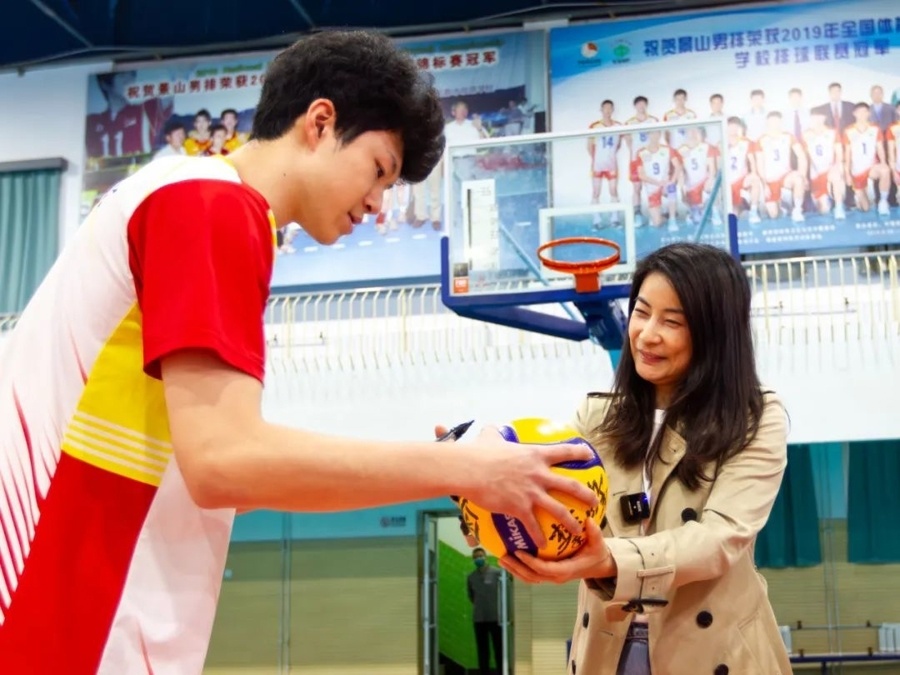 图说:在观看排球队训练时,她鼓励队员们:“人生要有一个目标,才会收获一次飞跃。”
